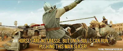 This scene of a ferocious Bhallaladeva running menacingly with a broken Gatha's(Mace) is also hilarious (doesn't everyone like to see the villain lose!), but what happened to the mace? Though the mace looks dented as if smashed onto something, a closer look shows that it is not dented but only half of the mace head is remaining and it looks as if the other half has been chopped off !!!